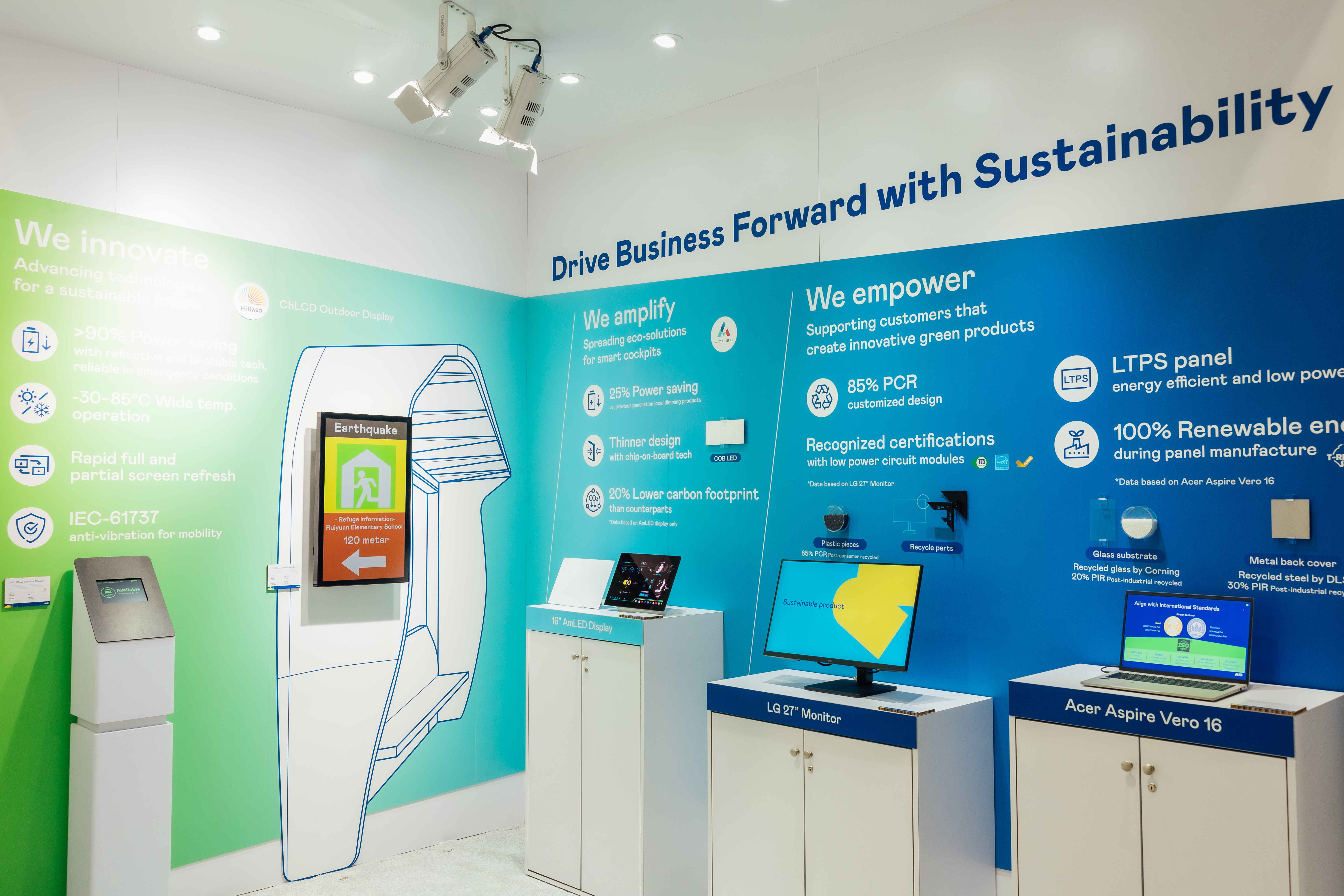 LEYU官網(wǎng)運(yùn)用創(chuàng)新顯示技術(shù)HiRaso膽固醇液晶雙穩(wěn)態(tài)技術(shù)達(dá)到顯示零耗能、擴(kuò)大節(jié)能省電的AmLED顯示技術(shù)應(yīng)用于車用LEYU官網(wǎng)、以再生的消費(fèi)后回收(PCR)塑料及全綠電生產(chǎn)之面板,應(yīng)用于筆電及螢?zāi)唬黾泳G色價(jià)值。