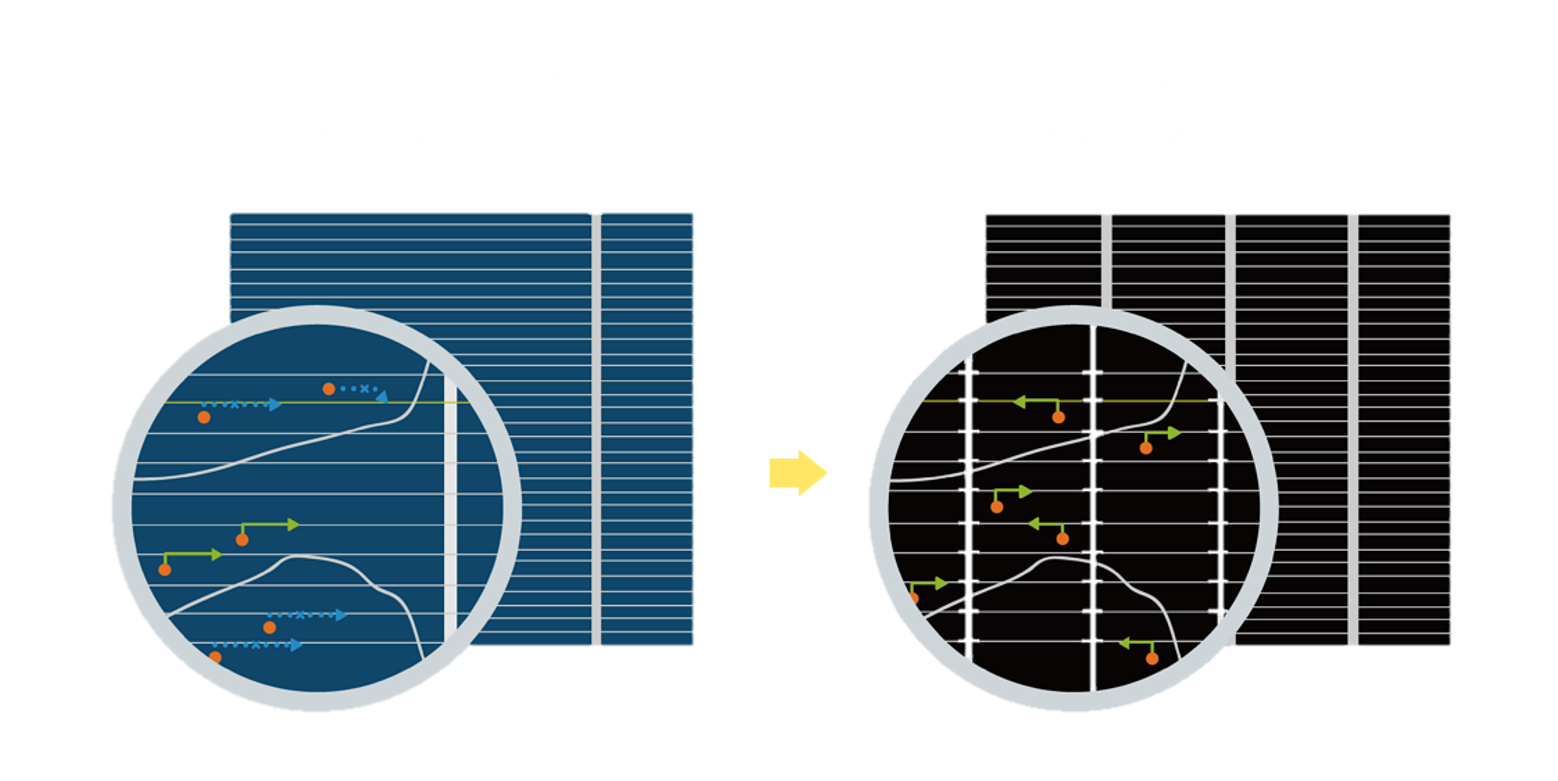 • 結合半切電池,降低遮陰影響、提升模組抗隱裂能力、并減少電阻損耗,進一步提升模組發電效能。