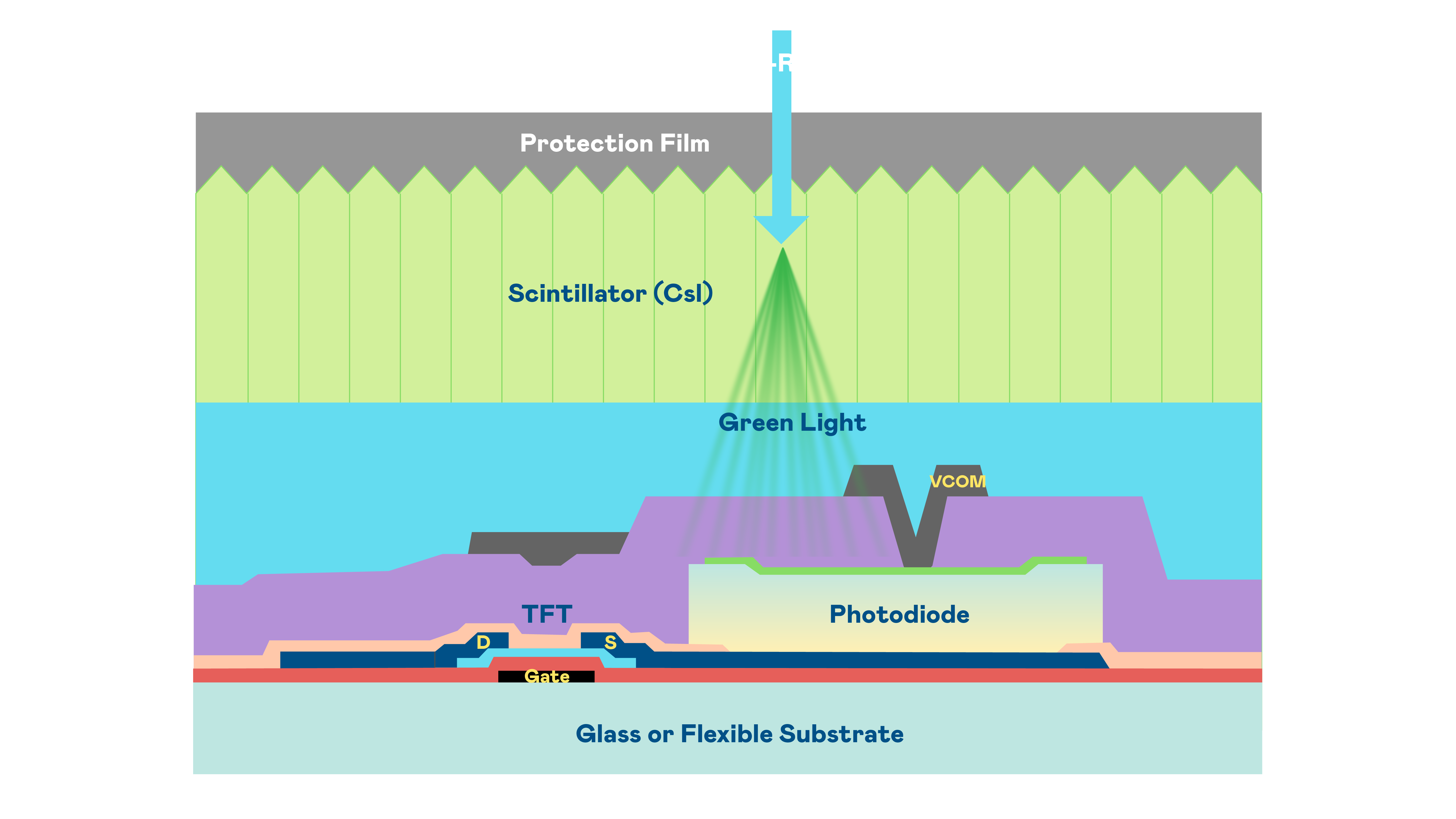 LEYU官網(wǎng)的X光影像感測陣列使用薄膜電晶體 (TFT) 作為每個(gè)像素的讀取開關(guān),搭配光電二極體(Photodiode)的光電轉(zhuǎn)換元件,用以感測X光影像訊號。